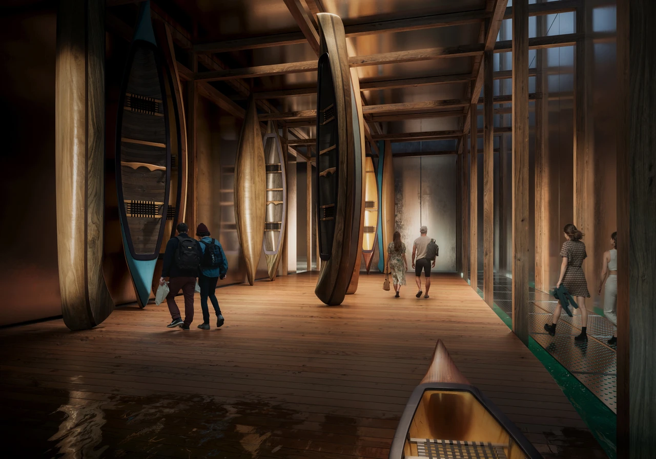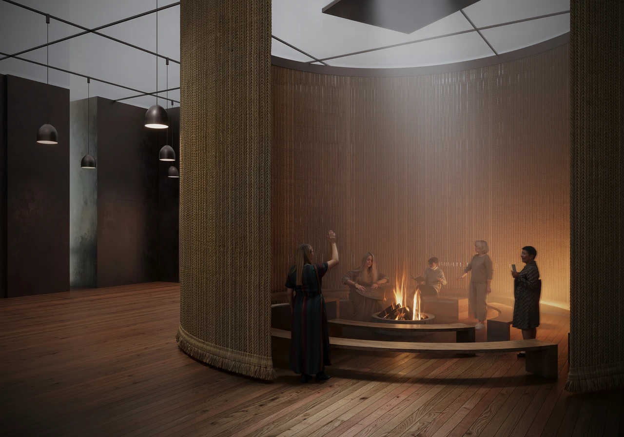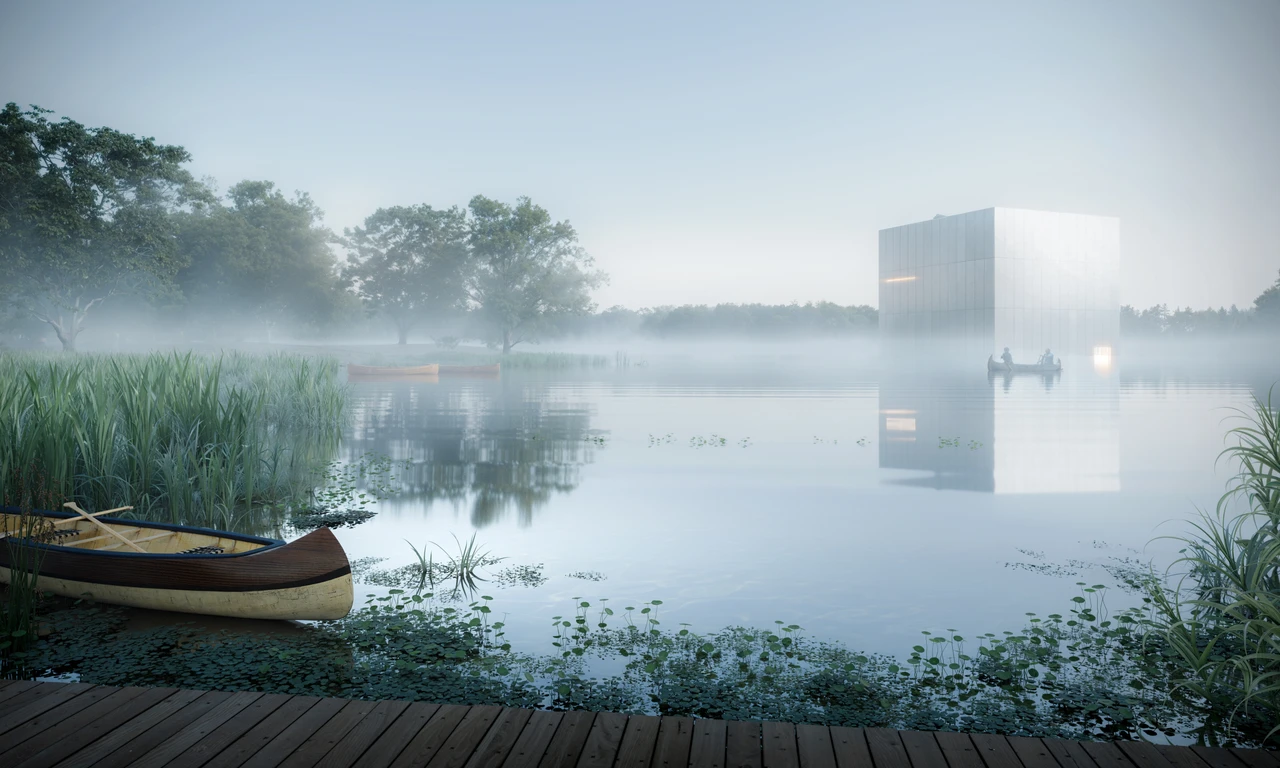 Anchored in water, framed by forest, Sacred Site is a study in stillness. A monolithic form floats in mist - silent, reflective, intentional. Inside, carved wood, fire circles, and suspended canoes tell stories without words. Designed as both a threshold and a vessel, the center invites visitors not to observe, but to listen. It does not echo the past - it holds it. It does not claim the land - it honors it.