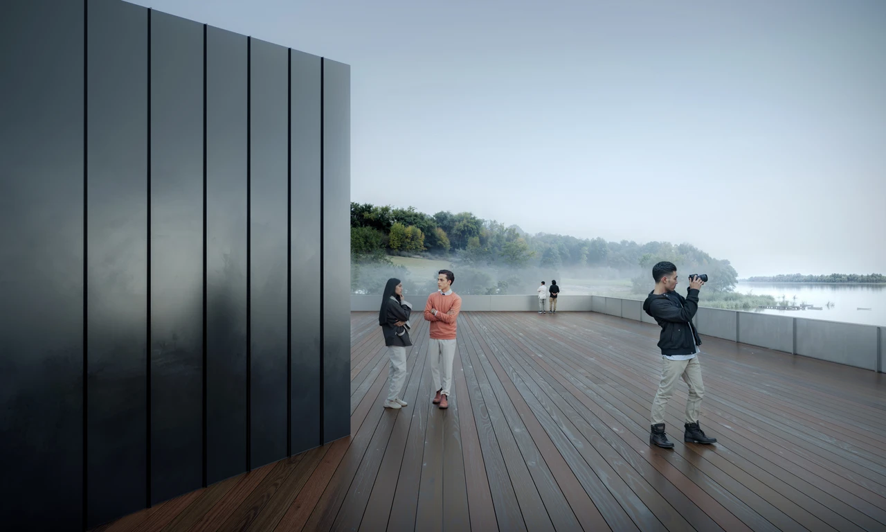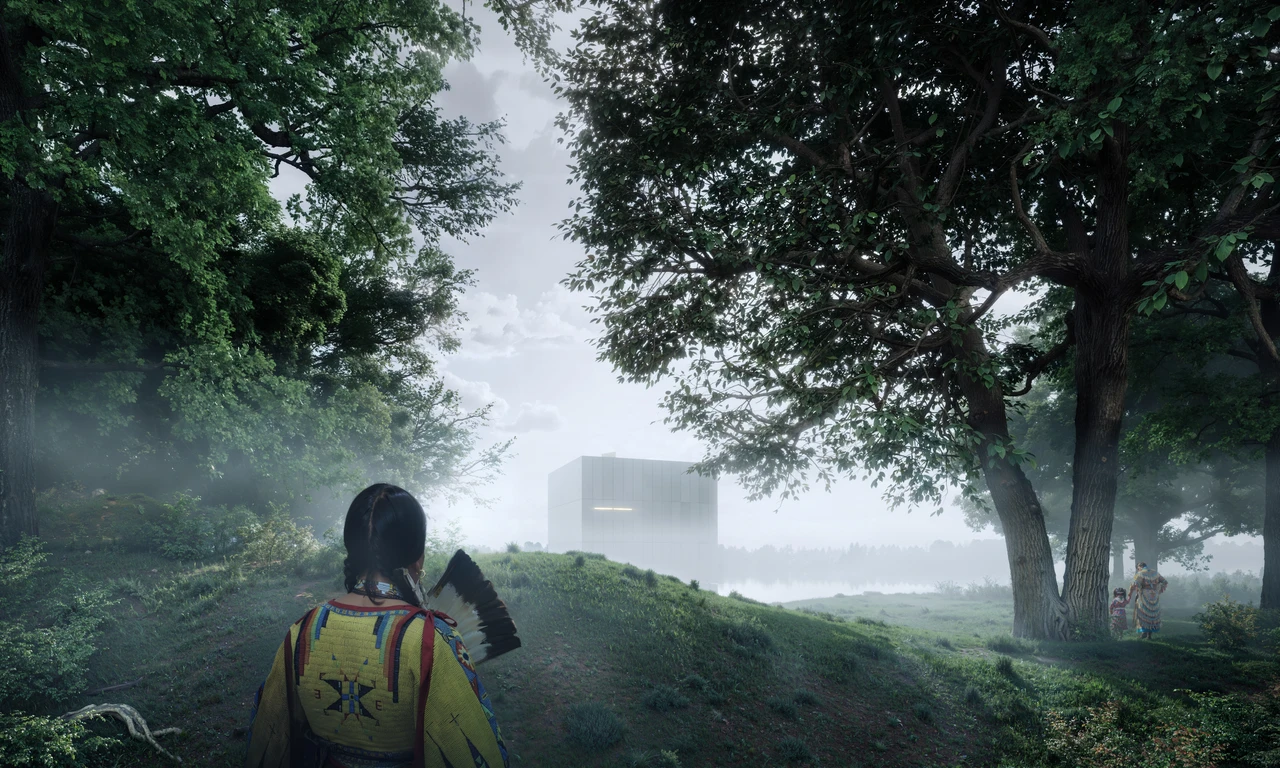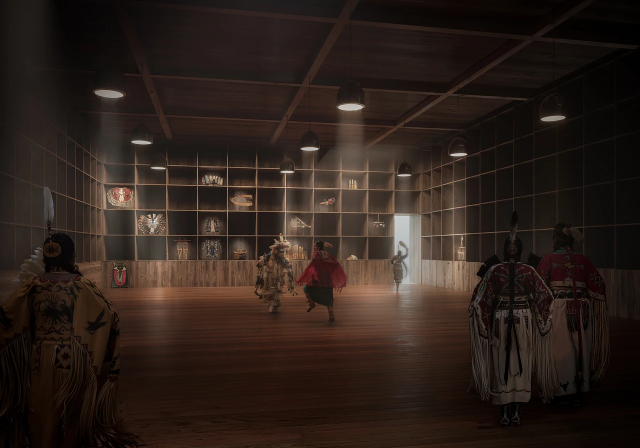 Anchored in water, framed by forest, Sacred Site is a study in stillness. A monolithic form floats in mist - silent, reflective, intentional. Inside, carved wood, fire circles, and suspended canoes tell stories without words. Designed as both a threshold and a vessel, the center invites visitors not to observe, but to listen. It does not echo the past - it holds it. It does not claim the land - it honors it.