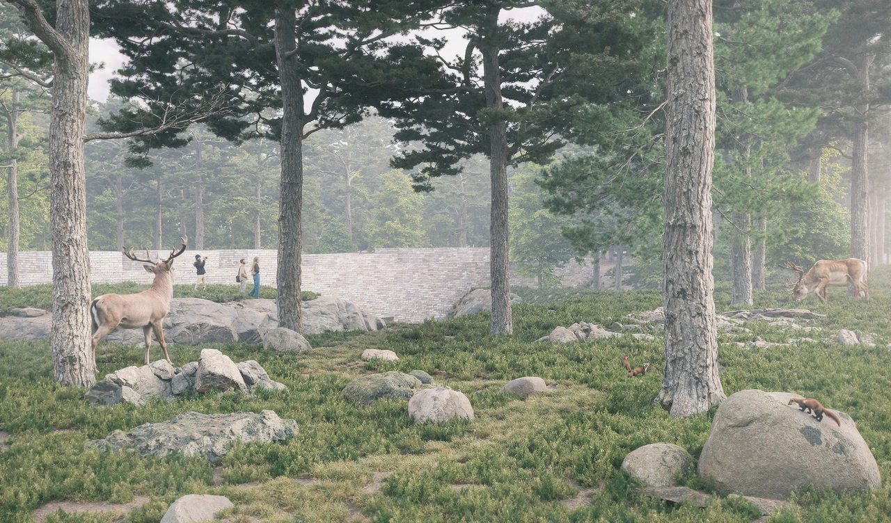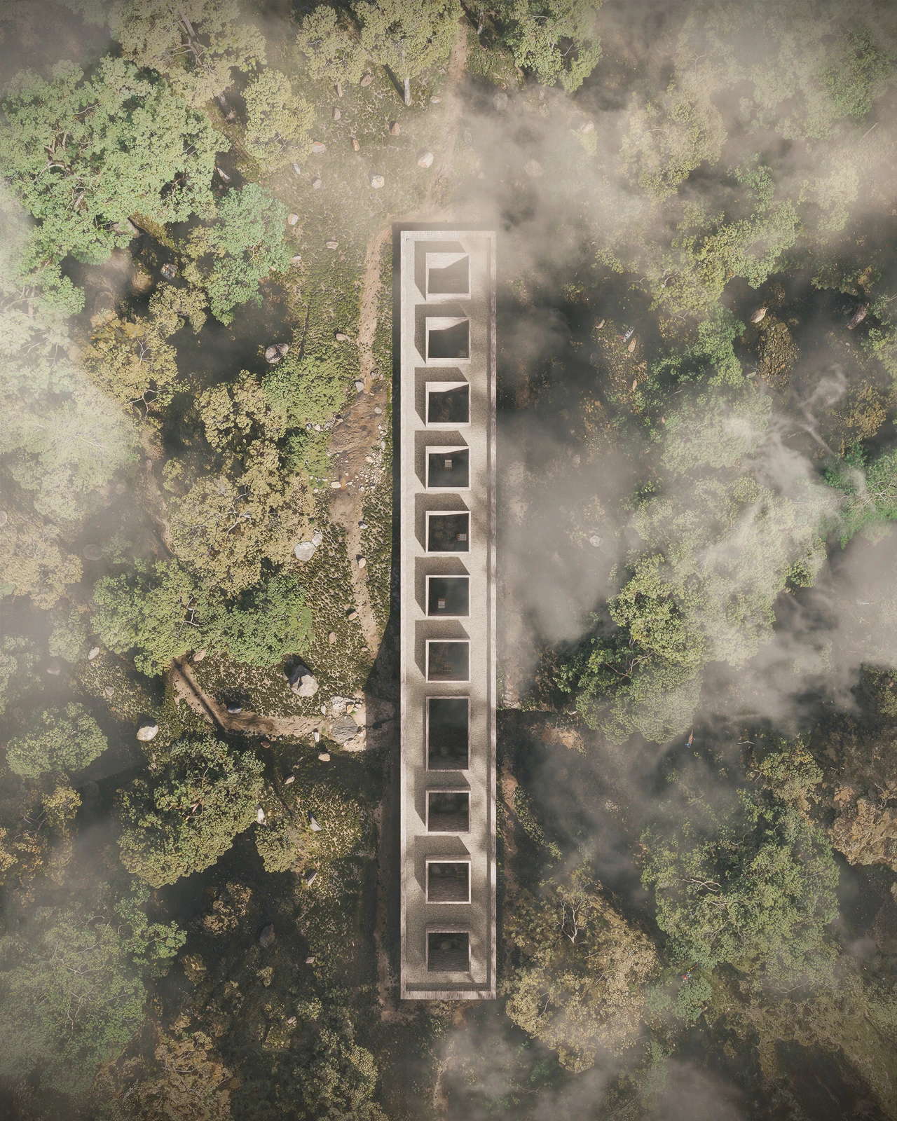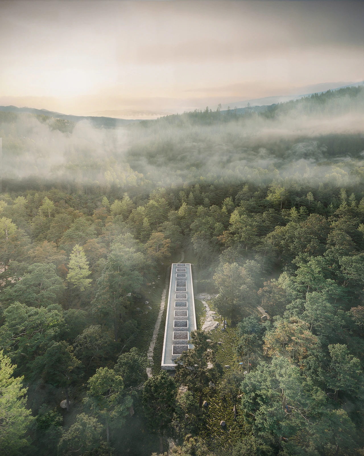 Designed as a container, the center invites visitors to occupy the space between two undulating planes: sky and earth. We feel the weight below.